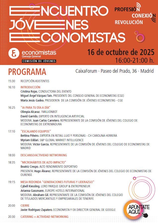 Un espacio de encuentro y networking diseñado para jóvenes economistas que buscan generar un impacto real en sus empresas. A través de ponencias y dinámicas centradas en el escalado de equipos, el liderazgo y la visión de las generaciones futuras, este evento ofrece inspiración y herramientas prácticas para potenciar el crecimiento profesional y empresarial.